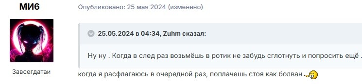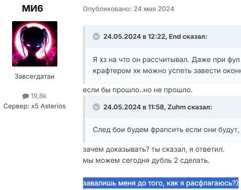 клоун такой клоун ну я напомню @Малесенька АВ вам еще повезло, что условия не было "убить за флаг" кстати, история забавная эта была, Зум этого очкошника поимел многократно, после чего на весь серв были визги, что его имели не так, как он ожидал, но кринж всей ситуации был том, что шиз дебафал овером танка и все равно всрал) п.с. изунчик с памятью рыбки, если бы ты хотя бы помнил, что сам писал до этого - было бы куда меньше проблем у тебя)) а еще если бы помнил, что другие пишут - было бы замечательно, т.к. ты бы помнил, что дагера я сливал и мне он нужен 76, но ты отказался от пвп. я даже готов поставить 40ккк. с тебя и 10 хватит