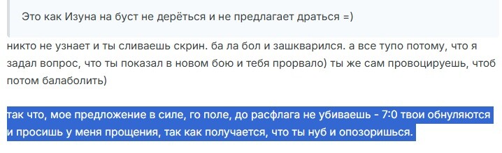 ты болван?)) ты это выставил так, будто это не ты лично предложил, а они накинулись на тебя толпой или догвоорились 1*1, а пришли вдвоем) почему же ты промолчал кода они писали про нечестное пвп о том, что это твоя идея?)) потому что понимал, что будешь в глазах сокланов выглядеть еще более ущербным)
