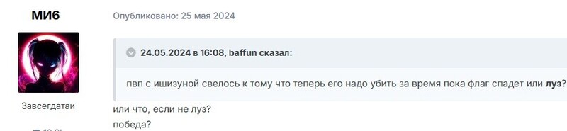 так он не хочет. он хочет что бы я за ним час бегал до афк-ничья) а такое мне не нравится, он помнится разнылся как-то, что теперь все будет только по его правилам, теперь условия диктует он (и ножкой топнул)! писал, что теперь кто не сольет его за флаг = проигравший, я предложил ему пвп и убить меня за флаг, я буду на слитом тх 76 лвл, он фыркнул) а так я очень жду его "врыв", что бы навалять ему с кланом, дабы поднять на смех перед всеми этих штурмовиков руны и фортов)