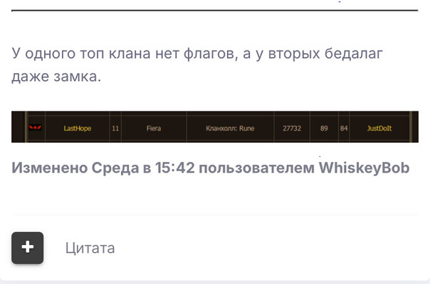 Мышонок Вилли. Два вопроса: тебя не смущает ответ Виски в своей теме про твой супер клан? (Скрин) тебя не смущает что у него нету места в клане? И да, спасибо что вынес мусор в замке.