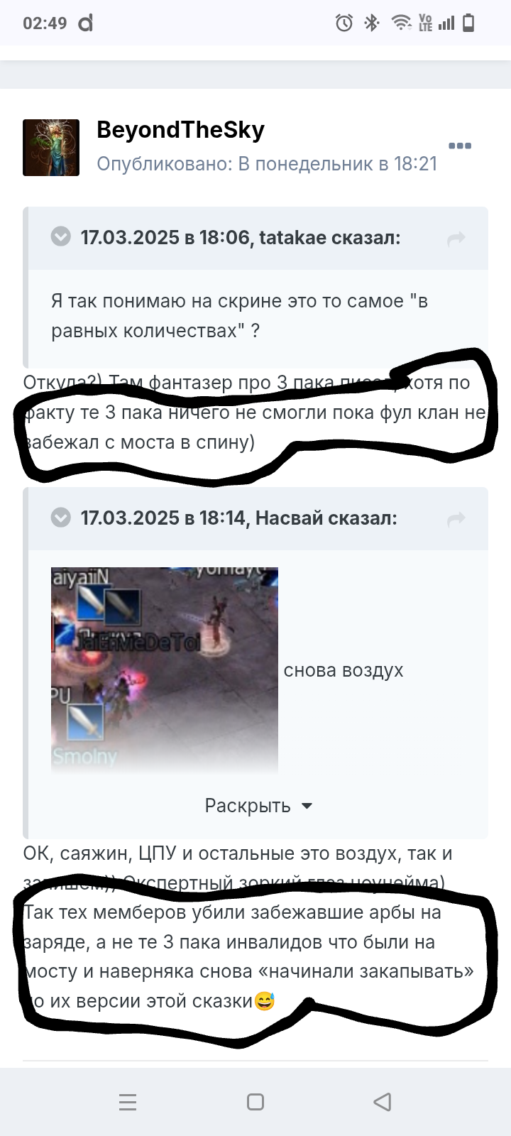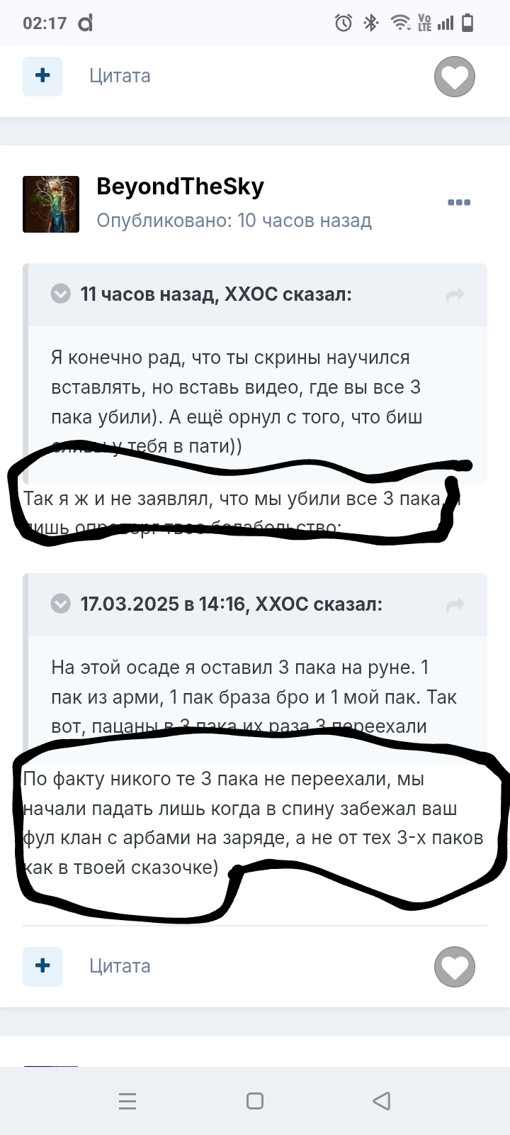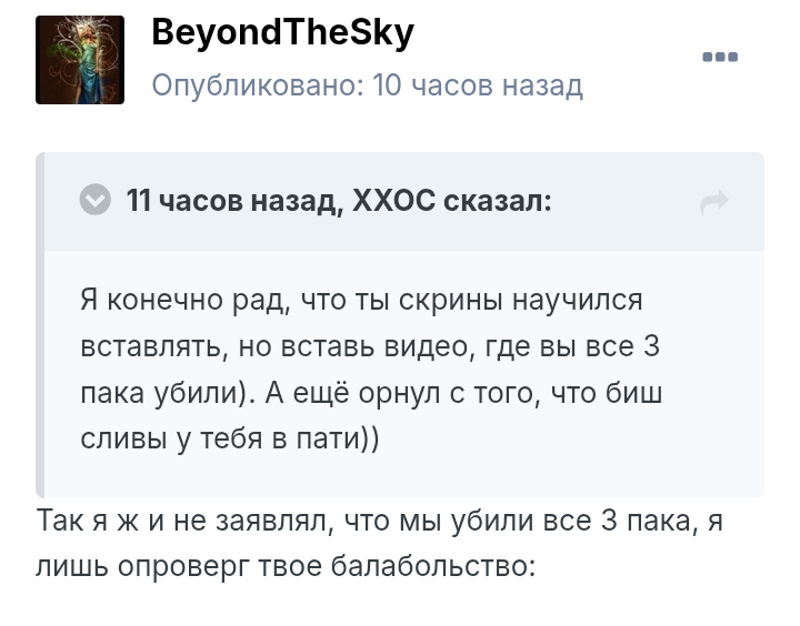 Не обращай внимания!) Этот тупорез уже 100500 раз переобулся в своих постах))) Сначала балаболил, что он развалил всех кто там был на кресте, а потом ему а спину залетел весь клан. Потом переобулся, мол уже не весь, а 2 пака арб под зарядом, хотя прилетели с другого замка почти альт бафе+- овер. Потом он начал приплетать другую ситуацию, про 3 пака и балабольство ххосса (когда на Руне действительно оставались 3 пака. Не пак ххосса, бразы и арми, а ххосс, юми и арми. Когда их гнали из осадки ссаными тряпками)! Теперь он балаболит про 2 пака на валике, когда на видео видно не вооружённым глазом, что хЕросы+слива минимум паков 5-6 держась за ручки, в добавок пак сосева, 3 пака ДФ! На видео видно, что ДФ сильнее грызлись за этого валика чем вся остальная шушера в виде хЕросов и сливы! По факту, там сидит этот балабол 30+ лет в своей Варшаве, или где он там обитает, и кроме как ктрл+ц-ктрл+в ничего не может! Балласт клана да и только! Максимум на что он сгодится это набор новичков в клан! Ах да, ещё добавлю! После изгнания в 2 пака арб с руны, у хЕросов в клане, мистическим образом появляется очередной луко пак))) После высера на форуме про мету ВЛа в пвп, у него появляется ВЛ на осаде!)))