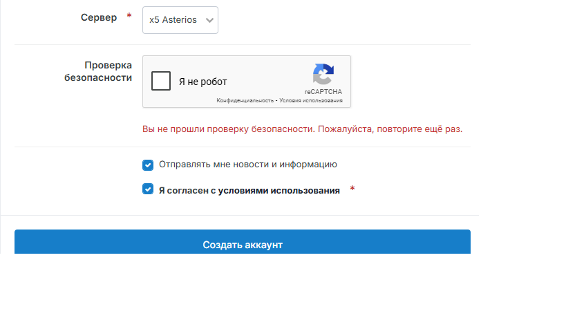 sborsik Опубликовано 18 сентября Автор Поделиться Опубликовано 18 сентября Попробовал зарегаться через фаерфокс и опера. В фаерфоксе так как и в гуглхром нечего не происходит, просто пишет Вы не прошли проверку безопасности. Пожалуйста, повторите еще раз. В опере выскачила капча с картинками, выбрал то что надо, после этого тоже самое Вы не прошли проверку безопасности. Пожалуйста, повторите еще раз. В чек бокс кликаю по несколько раз, без изменений. Для самой игры аккаунт регистрируется без проблем, для форума не получается. На других сайтах проверка капчи тоже без проблем проходит. 0 Цитата Ссылка на комментарий Поделиться на другие сайты Поделиться